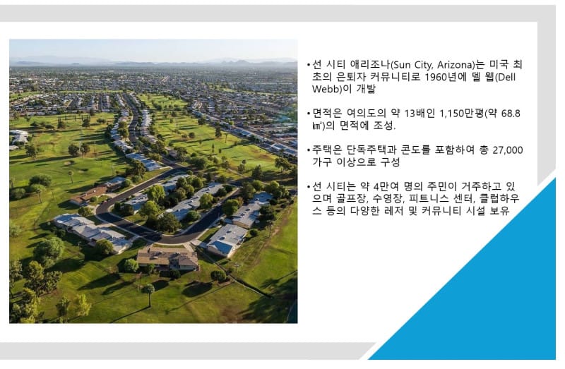 이 글에서는 미국에서 시작된 액티브 시니어 타운의 개념과 운영 형태를 우선 살펴 보겠습니다.