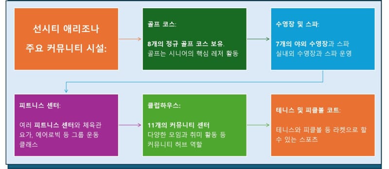 레저 및 사회적 활동: 이곳에서는 다양한 레저와 사회적 활동을 제공합니다. 선시티 애리조나 경우를 보면 8개의 정규홀 골프 코스, 테니스 코트, 7개의 수영장 뿐만 아니라 예술 공예실, 연극 공연장, 동호회 등을 소화할 수 있는 11개의 클럽하우스까지 마련되어 있습니다. 또한 플로리다의 빌리지 타운에서는 매주 열리는 음악회, 다양한 예술 수업과 소셜 클럽 모임 등 시니어들이 활발하게 교류할 수 있는 기회를 제공합니다.