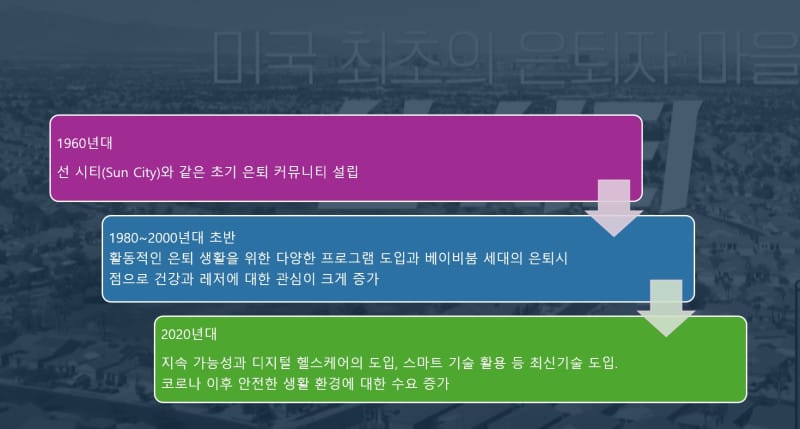 미국 애리조나주 ‘선시티’ 프로젝트에서 처음 시작된 새로운 실버타운은 급격히 늘어나는 은퇴 인구와 변화하는 미국인의 라이프스타일에 맞추어 발전해 왔습니다. 시니어들이 원하는 것은 단순한 휴식이 아닌, 적극적인 취미와 교류를 통해 ‘새로운 삶의 시작’을 경험하는 것이었습니다.